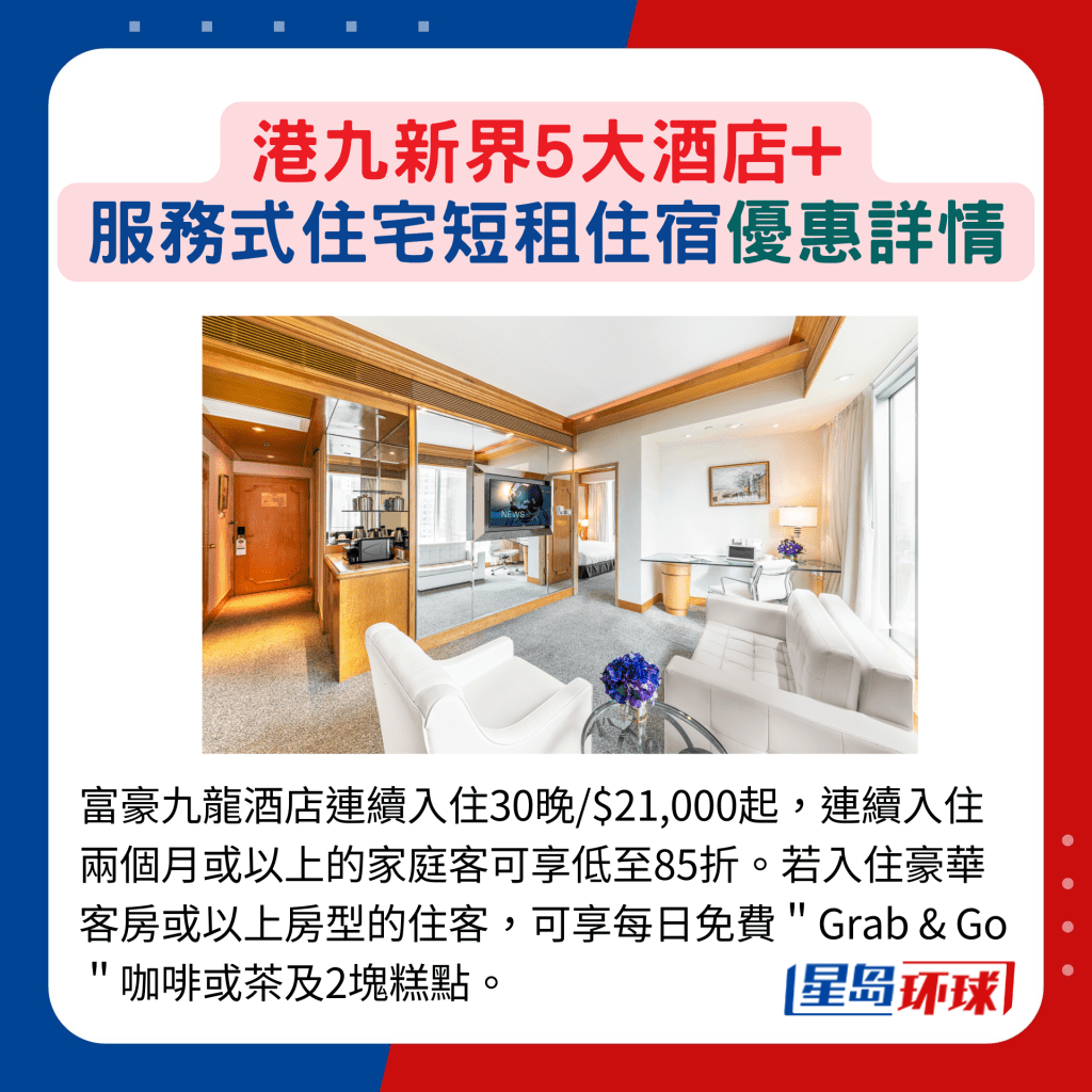富豪九龍酒店連續入住30晚$21,000起,連續入住兩個月或以上的家庭客可享低至85折。