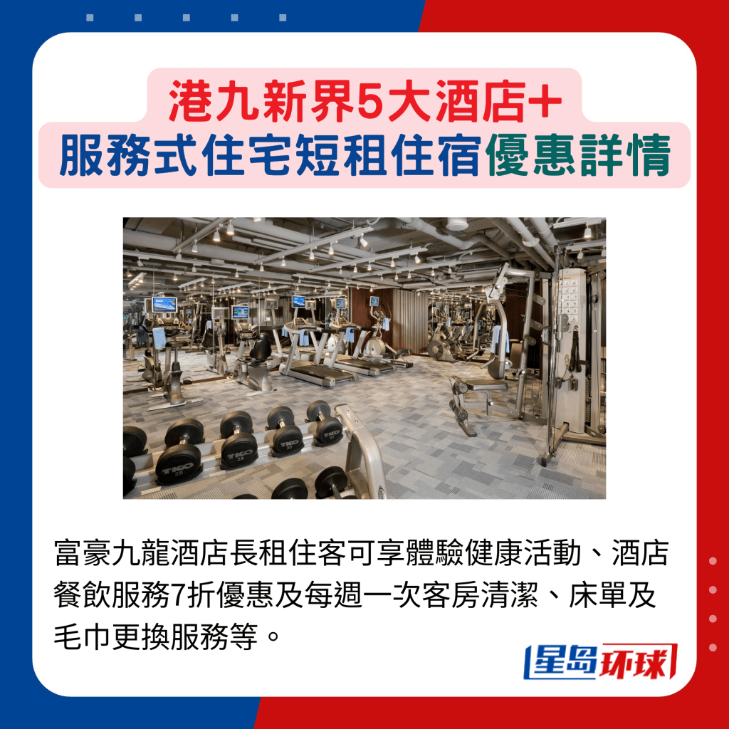 富豪九龍酒店長租住客可享體驗健康活動、酒店餐飲服務7折優惠及每周一次客房清潔、床單及毛巾更換服務等。