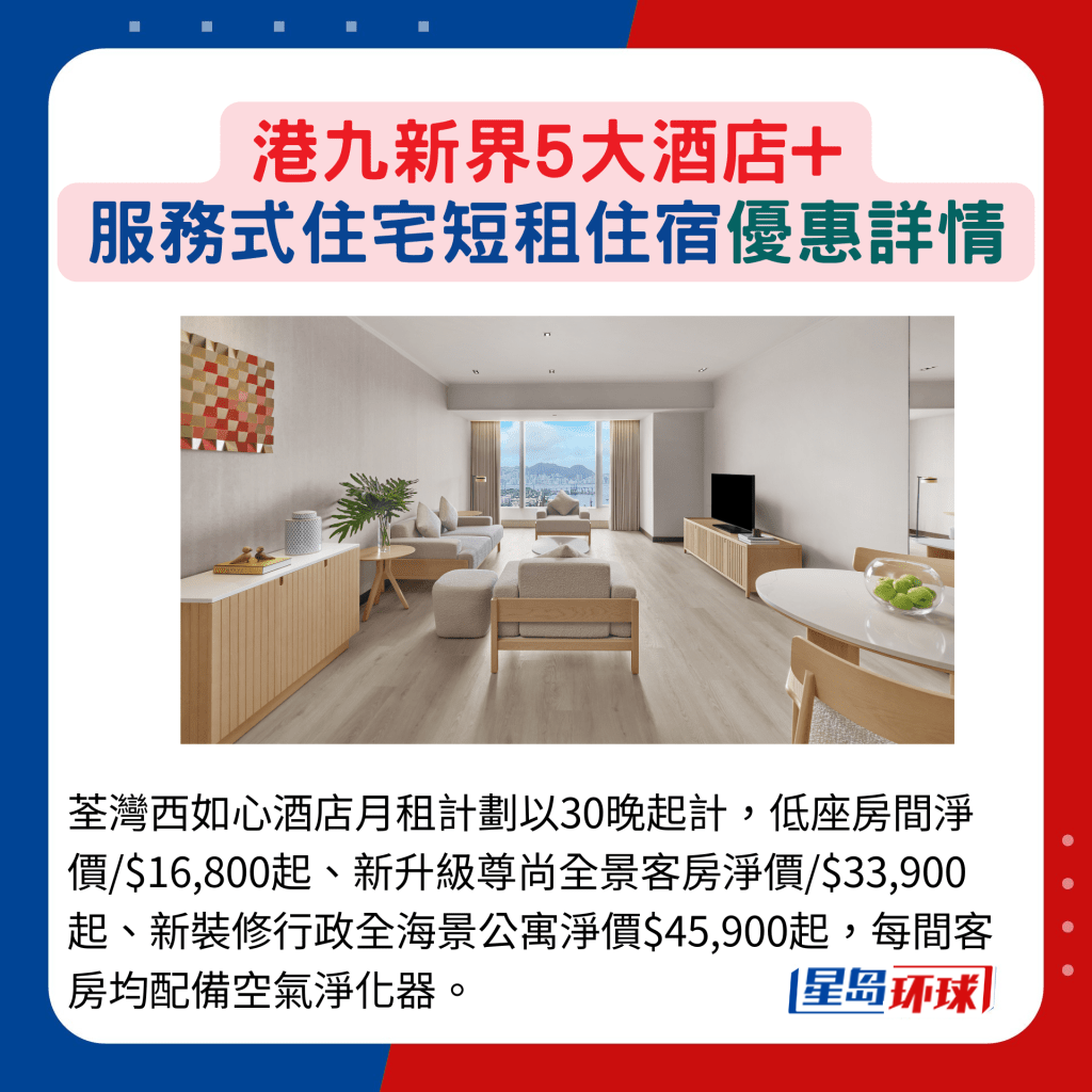 不論是家居裝修還是到港商旅,需要至少連續數周或以上的短租住宿,酒店及服務式住宅都是熱選。除了地點及交通是 優先考慮,追求優質起居生活的話,設施、餐飲,甚或寵物友善服務等同樣重要,香港不同地區都可找到提供免費早餐、健身課堂、購物著數,以至連續住宿折扣等優惠的酒店。今日就為大家推介5間分別位于港、九及新界的高性價比優質選擇。