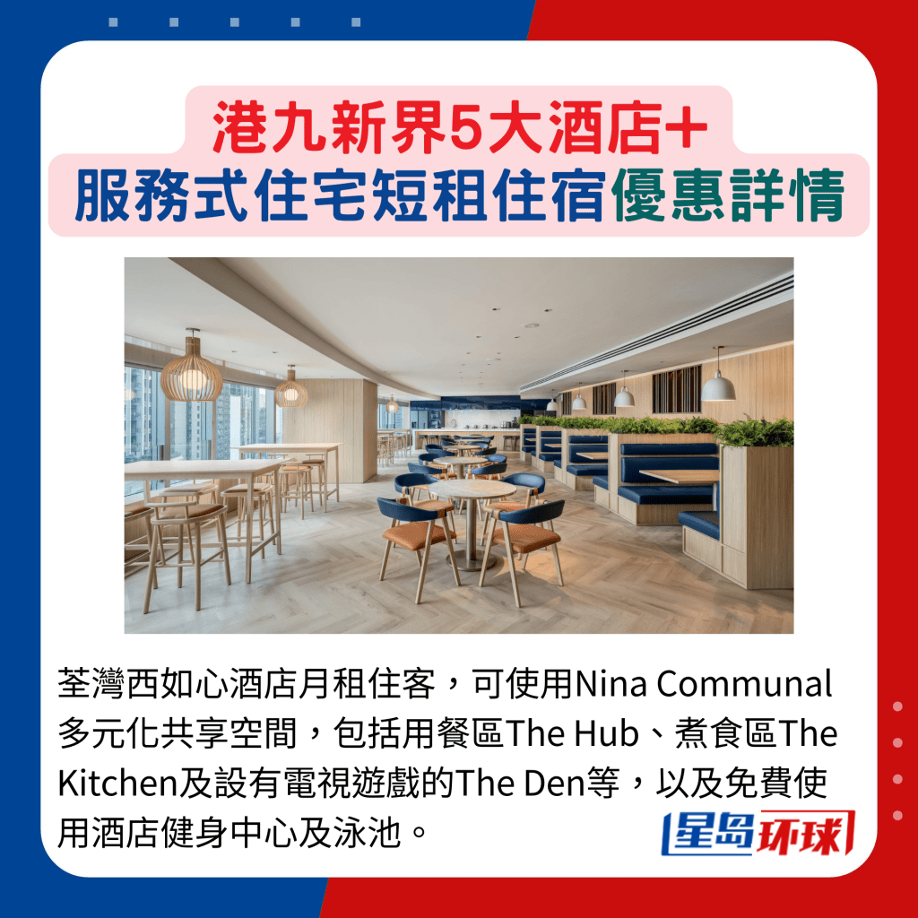 荃灣西如心酒店月租住客,可使用Nina Communal多元化共享空間,包括用餐區The Hub、煮食區The Kitchen及設有電視游戲的The Den等,以及免費使用酒店健身中心及泳池。