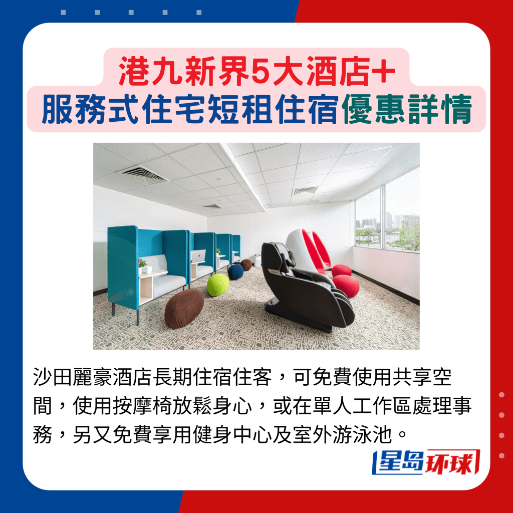 沙田麗豪酒店長期住宿住客,可免費使用共享空間,使用按摩椅放松身心,或在單人工作區處理事務,另又免費享用健身中心及室外游泳池。