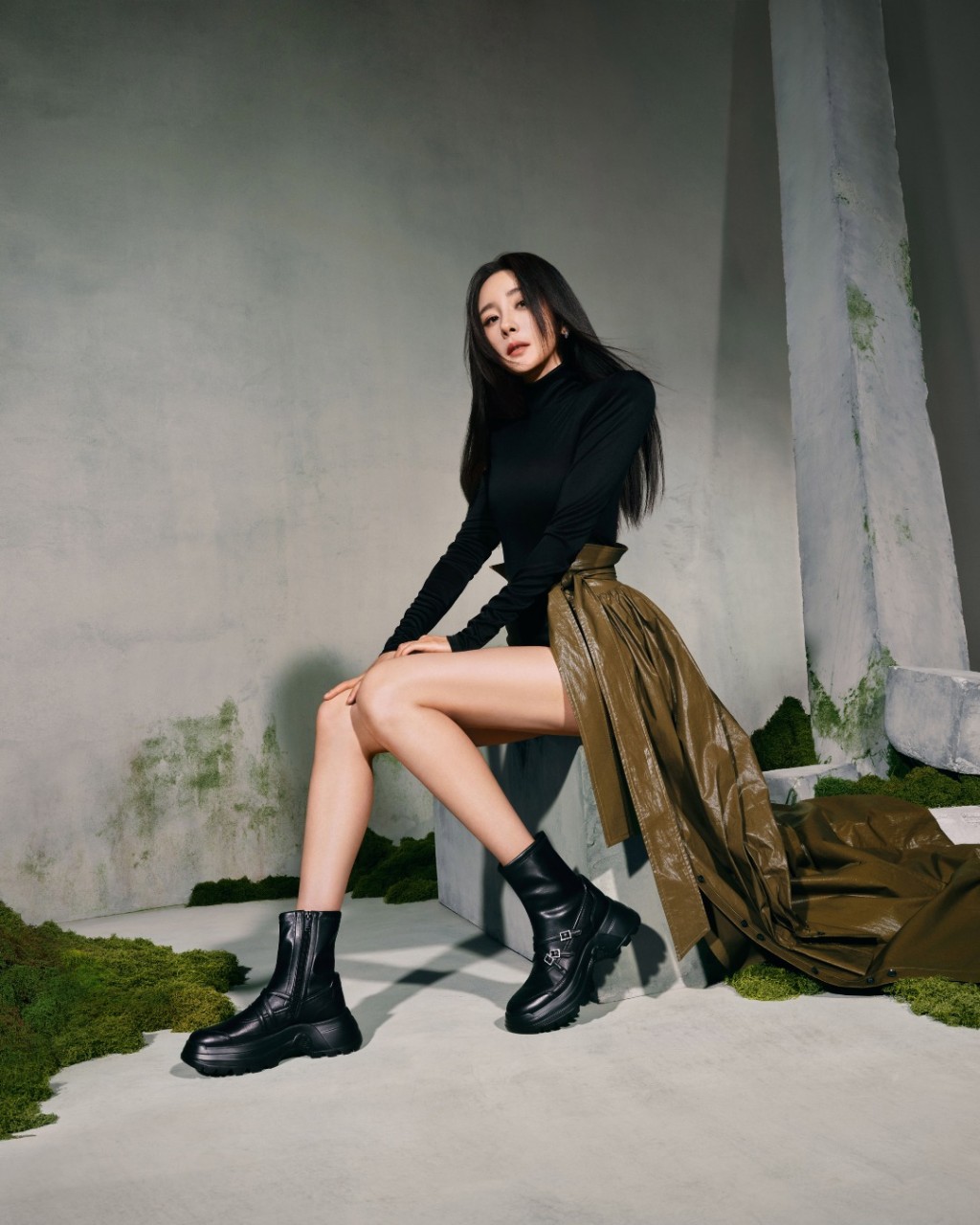 ▲楊冪以黑色厚底短靴/$1,890,配搭黑色上衣及百褶半截裙,造型剛柔兼備。(S/圖片來源:Facebook@Staccato)