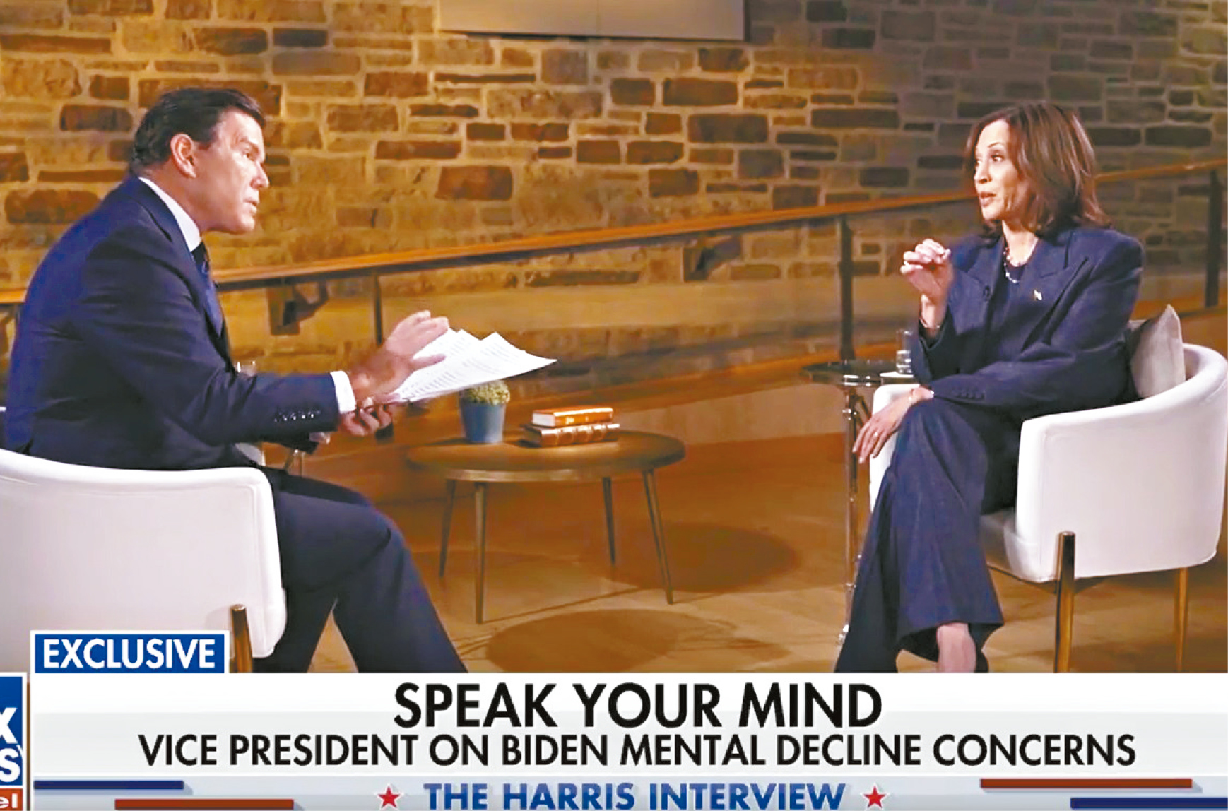 專訪期間,拜爾談到現任總統拜登的心智健康,詢問哈里斯何時開始發現拜登“能力似乎下降”。 哈里斯未有直接回應,只表示自己親眼目睹拜登作出各項重要決策,依然具備經驗和判斷能力,又表示拜登現在已不是總統候選人,相反共和黨候選人是特朗普,希望媒體“全面評估事實”,暗示特朗普的身體和精神狀況令人擔憂。