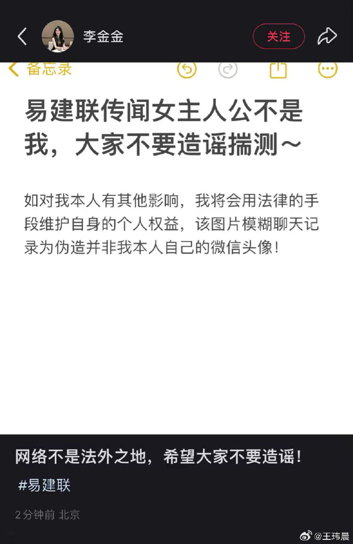 “京城喬姐”李金金在小紅書發文澄清,聲稱易建聯傳聞的女主不是他。