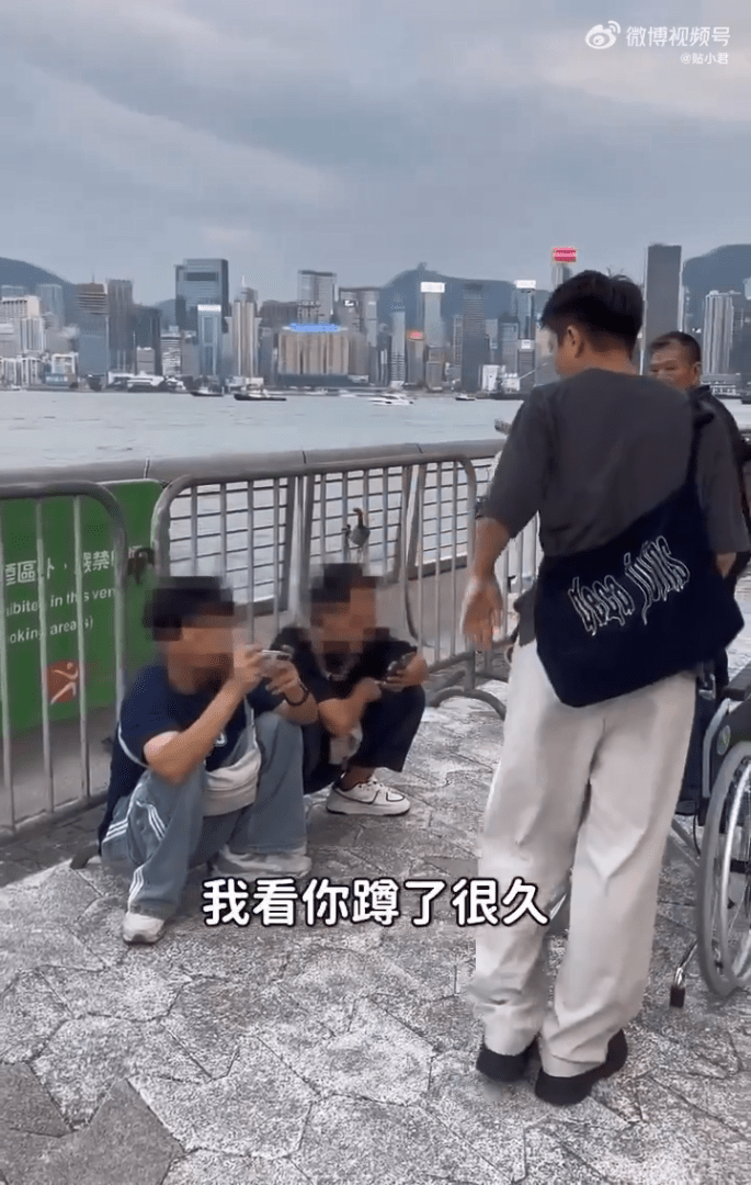 影片中,他們用粵式普通話,詢問5至6名蹲在地上的內地游客,語氣疑似嘲笑對方。游客聽后均表示沒有問題,有些人更直接站起來離開。