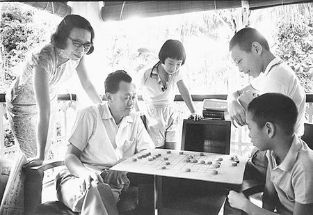 ▲李光耀與童年李顯龍下象棋,妻子柯玉芝及李顯揚、李瑋玲在旁觀戰。