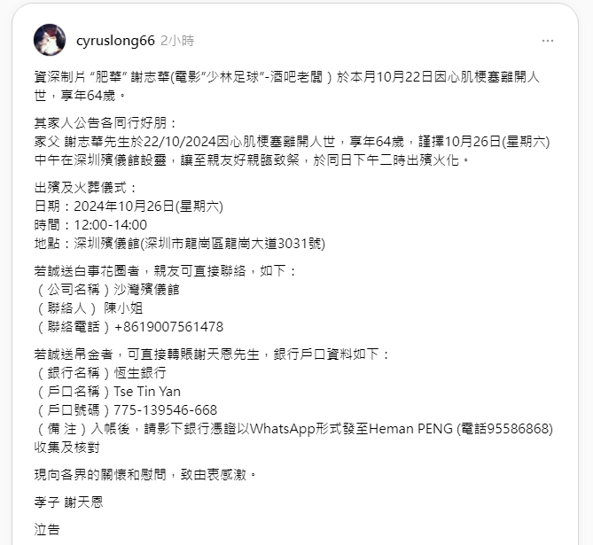 謝志華兒子謝天恩透過友人,昨日于社交平臺Threads轉發訃聞,公布喪禮詳情,訂于10月26日12時在深圳殯儀館設靈,并于同日下午2時出殯火化。此外,花圈另有查詢熱線安排,帛金可直接轉賬謝志華兒子謝天恩戶口。最后,謝志華兒子謝天恩感激各界的關懷和慰問。
