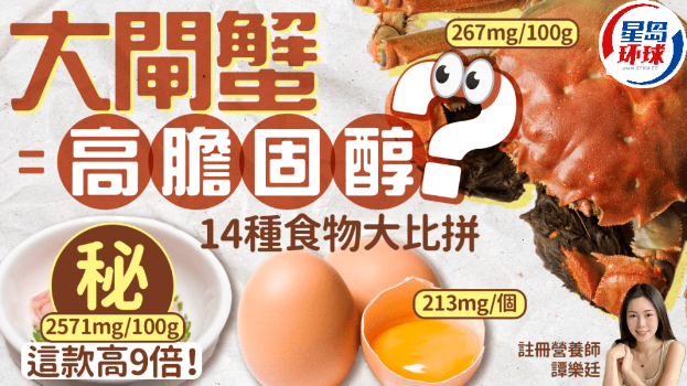 至于大閘蟹方面,譚樂廷表示一只4至5両重的大閘蟹約含267毫克膽固醇,不過她表示不用太擔心,間中吃1至2只絕無問題。名單中含膽固醇最高的是豬腦,比大閘蟹高逾9倍。
