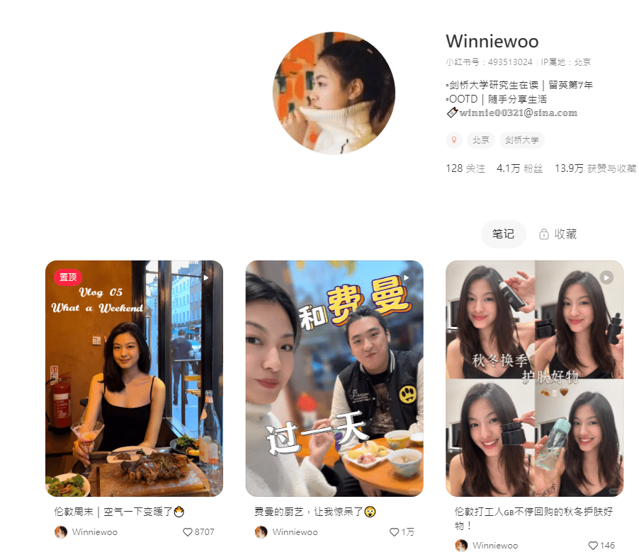 翻查Winniewoo的小紅書,她是一名劍橋研究生,在外地時已開始經營自己的頻道,分享生活點滴及美妝之道,而近日回到國內,便實時找當年好友吳費曼拍片。從Winniewoo的照片可見,她長發披肩,上圍豐滿,皮膚白晢,整體甚有氣質。