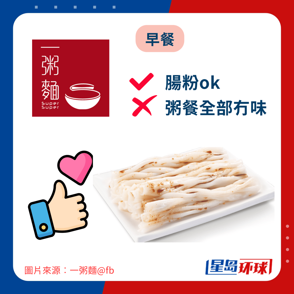 他們分別從早、午、下午茶及晚餐去評論這4間快餐店的食品,而且列出每間餐廳推介及不推介點的食物,部分更包括不建議原因。 以早餐為例,自言是“茶餐廳之友”的他們就認為,茶記早餐每份要40多元,“但不可像大家樂和大快活般有彈性,點兩肉配蘿卜糕再加粥或米粉”,所以早餐的話他們必定去大家樂和大快活。 他們亦大贊大家樂的雞扒、蘿卜糕、柴魚花生粥、雪菜肉絲米及炒蛋值得推介,而大快活則有肉燥撈米粉及皮蛋瘦肉粥,惟一粥面的早餐就“全部冇味粥難食,但腸粉ok”。