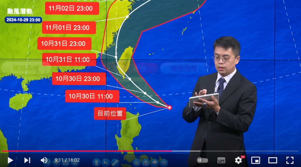 氣象署預報中心科長林伯東指出,無論是海溫以及垂直風切,都是有利于臺風發展的條件,因此康芮仍持續增強,且暴風圈還會更大。(圖/氣象署直播)
