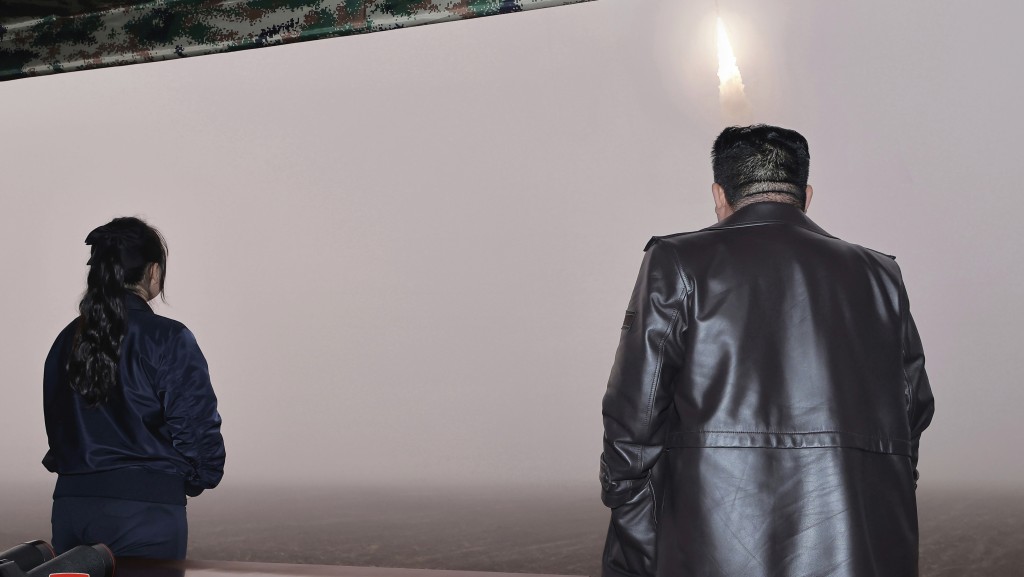 朝鮮領導人金正恩(右)與女兒視察火星-19洲際彈道導彈發射。 美聯社