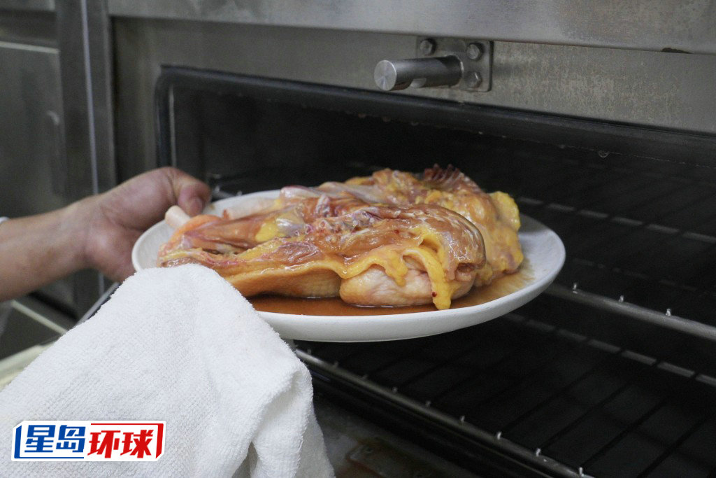 將鮮雞洗凈及瀝干,切開雞背,加入腌料腌12小時。