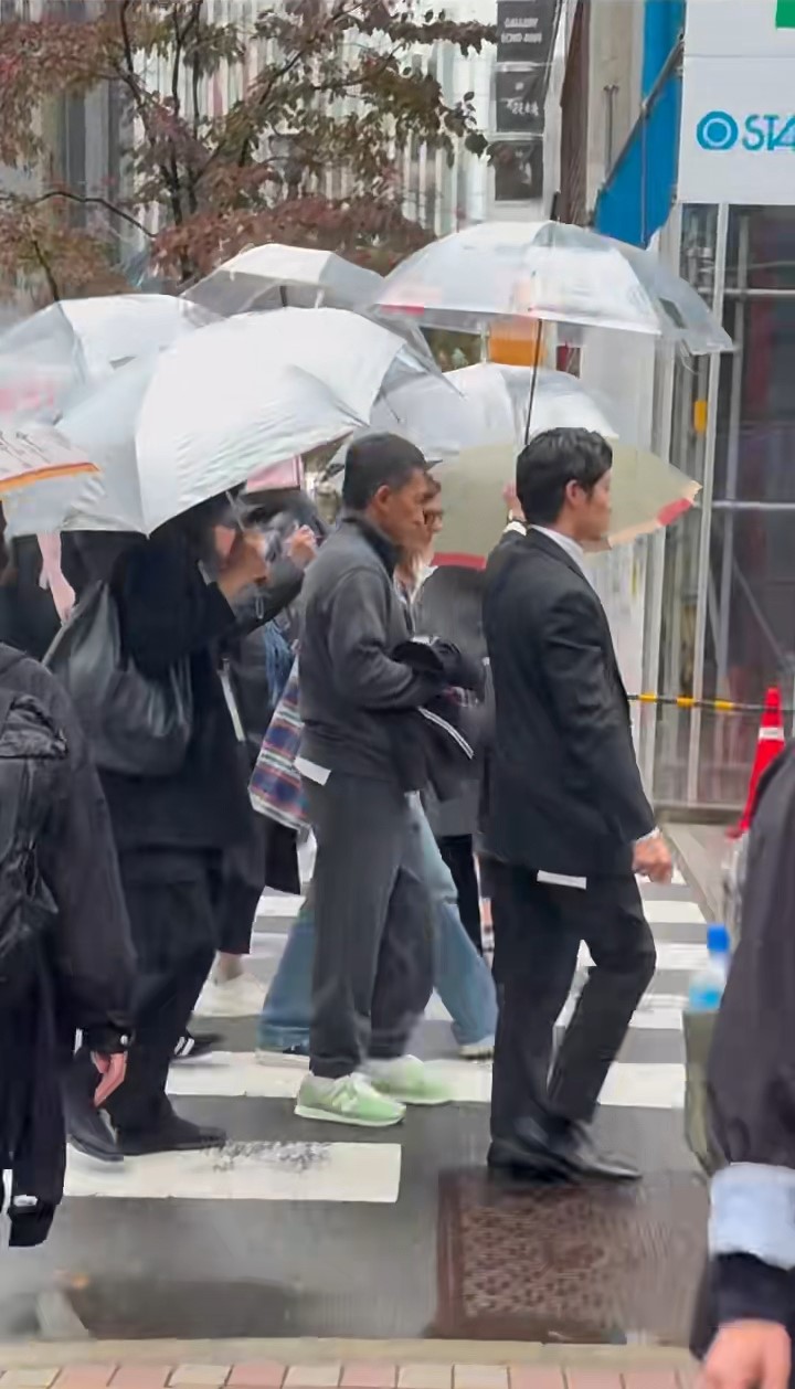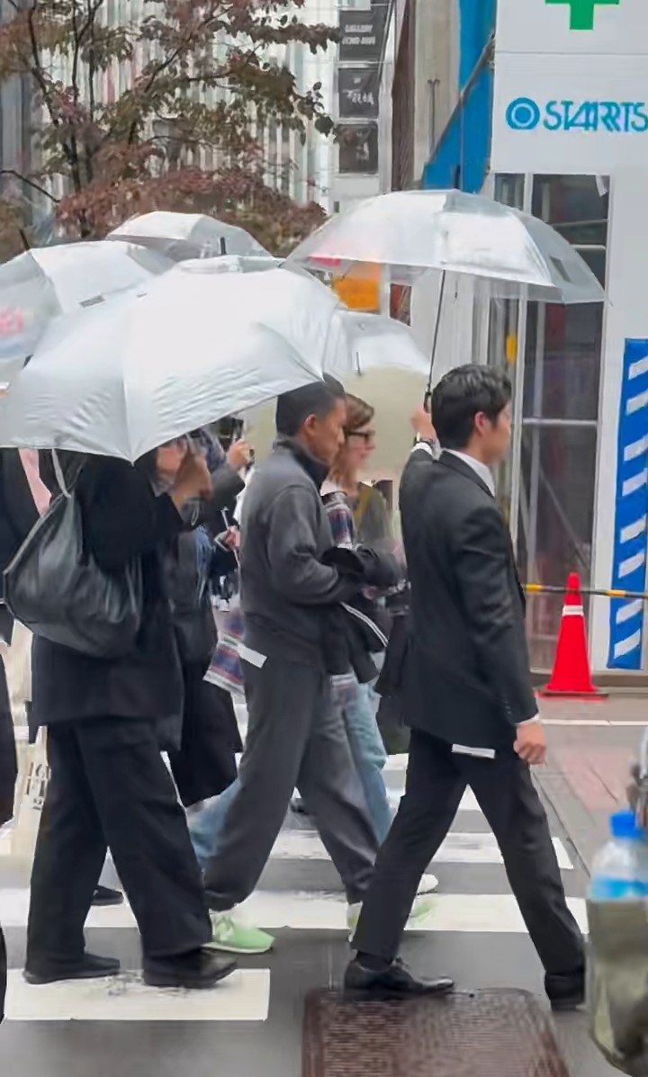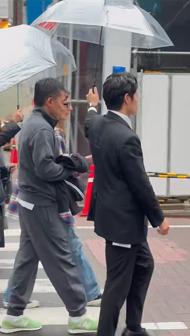 影片可見,梁朝偉一身灰色運動裝束,手揸一件黑色外套在銀座現身,他一行多人越過斑馬線慢步行。 當時天氣不穩,下著毛毛細雨,梁朝偉前面有一個穿黑色西裝疑似是保安的男士為他打傘,梁朝偉身旁及身后都有多名穿黑衣的工作人員同樣為他打傘,而梁朝偉則忙于跟身旁的外藉女子說話,如此大排場,絕對招徠途人目光。