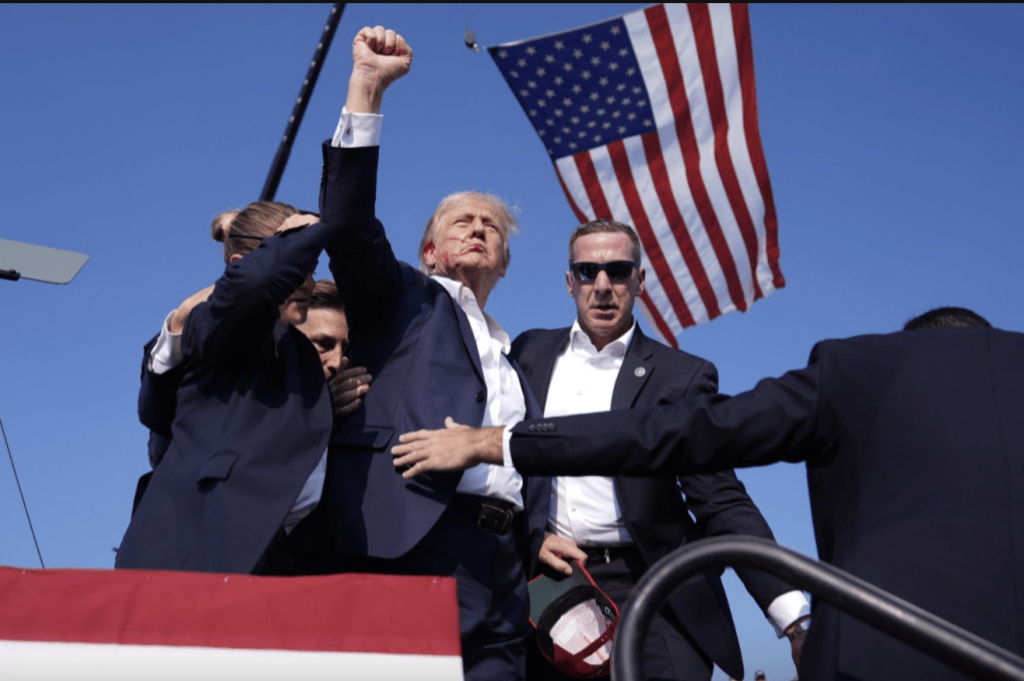 ▲這張特朗普遇刺受傷后,在國旗下振臂的照片成為經典照。 美聯社