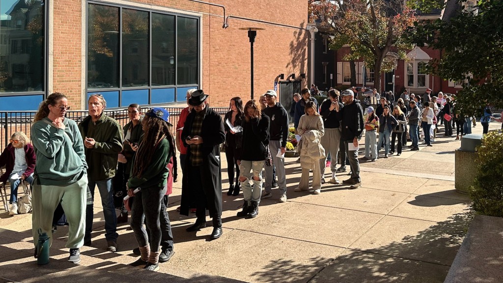 ▲2024年10月29日,賓州多伊爾斯敦居民大排長龍,在最后一天申請按需郵寄選票。 美聯社