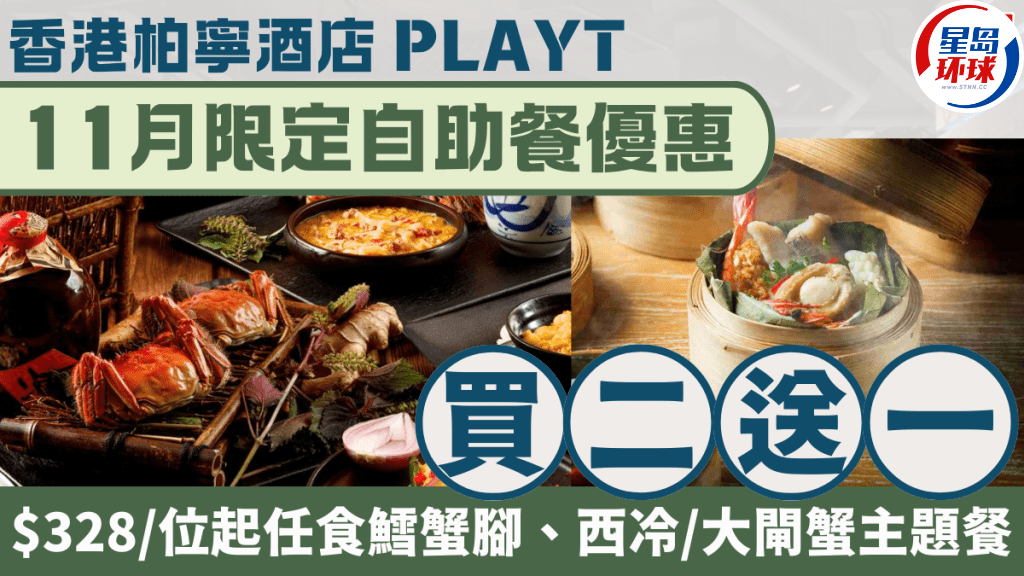 香港柏寧酒店自助餐餐廳 PLAYT美食款式包羅萬有,無限量供應龍蝦、即開生蠔、滋潤燉湯、古法雙冬羊肉煲、蟹黃三鮮豆腐煲等矜貴美食,于即日起至11月10日期間特設“十月邂逅”大閘蟹自助餐,呈獻一系列由江蘇大閘蟹制作的菜式,必食之選包括蟹粉燴魚肚及大閘蟹粉花膠羹,另外每位賓客可額獲贈兩隻約重4両的清蒸大閘蟹,現時于KKday網站或手機應用程式內預訂,即可享有買二送一優惠,自助晚餐低至$589/位(原價$845/位)連加一服務費。