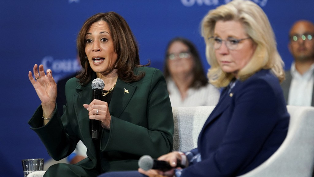 哈里斯(左)獲共和黨前眾議員利茲切尼倒戈站臺。 路透社