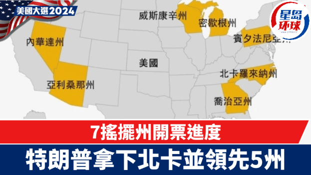 其它6個搖擺州,特朗普拿下了北卡羅來納,另外在威斯康辛、密歇根、喬治亞和賓夕法尼亞也領先,哈里斯則在亞利桑那領先。