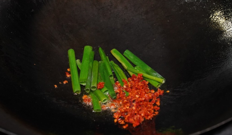 起油鍋爆香蔥段及辣椒,下蟹件炒勻。