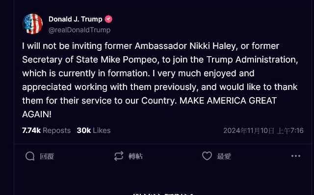 較早前有美國媒體表示,新當選美國總統很可能邀請多名前下屬重回政府,其中包括前美國駐聯合國大使黑莉,及前國務卿蓬佩奧。不過,特朗普今日在社交平臺“X”表示,他不會這樣做。
