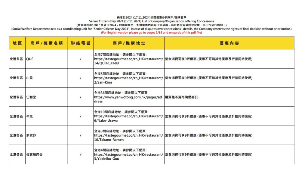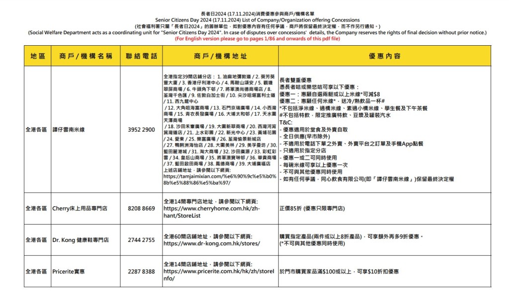參與的食肆及店鋪名單詳情,可按入社署網頁及“長者咭計劃”流動應用程序亦載有相關資料。