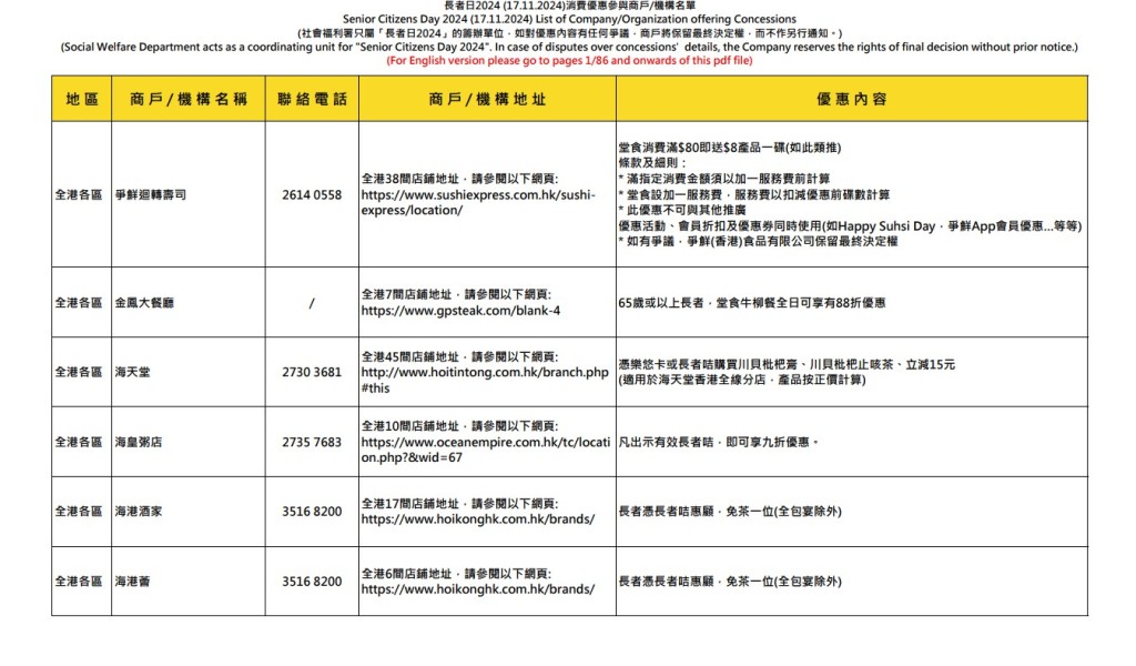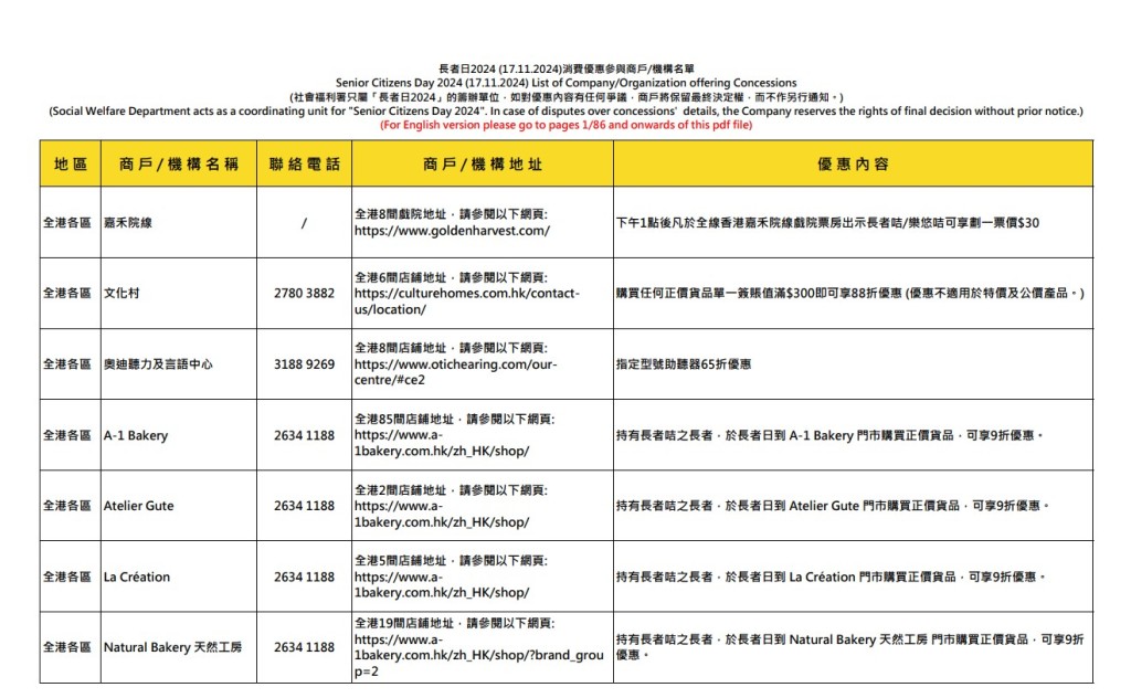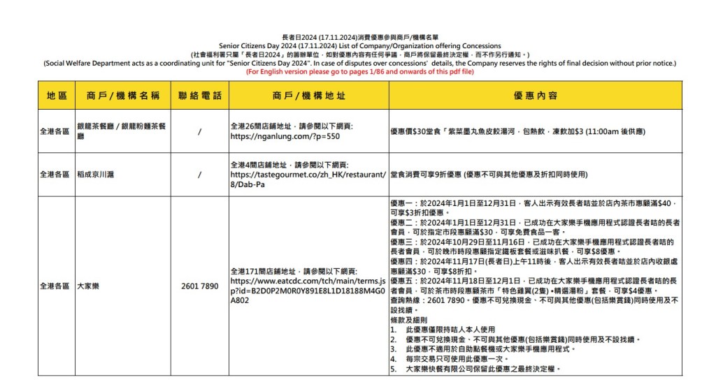 【長者日/長者咭/優惠】下周日(17日)是“長者日”,社署籌辦“長者日消費優惠”活動,邀請本地飲食業、零售業和其他商戶于當日向持長者咭的長者提供特別折扣和優惠。全港18區有超過400間機構和商戶參與,包括超過1800間食肆、零售店鋪及服務行業商戶。