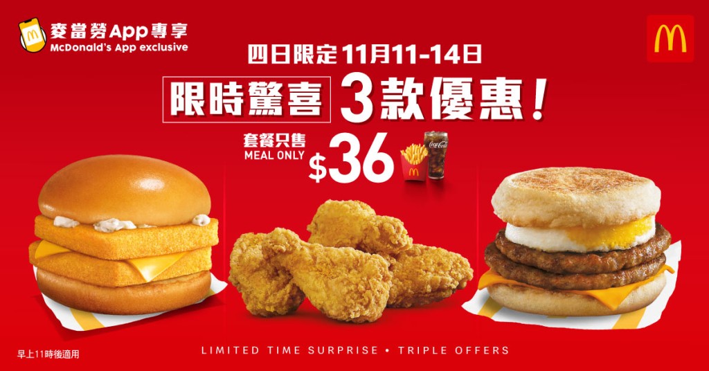 麥當勞App將于11月11日(一)至11月14日(四)推出“晚上6時起指定超值套餐優惠減$5”,而深受歡迎的“$36超值套餐”亦會繼續加推,麥當勞App用戶獨家專享$36雙層魚柳飽套餐、雙層豬柳蛋漢堡套餐,以及脆香雞翼(4件)套餐,讓大家以超值價品嘗美食。