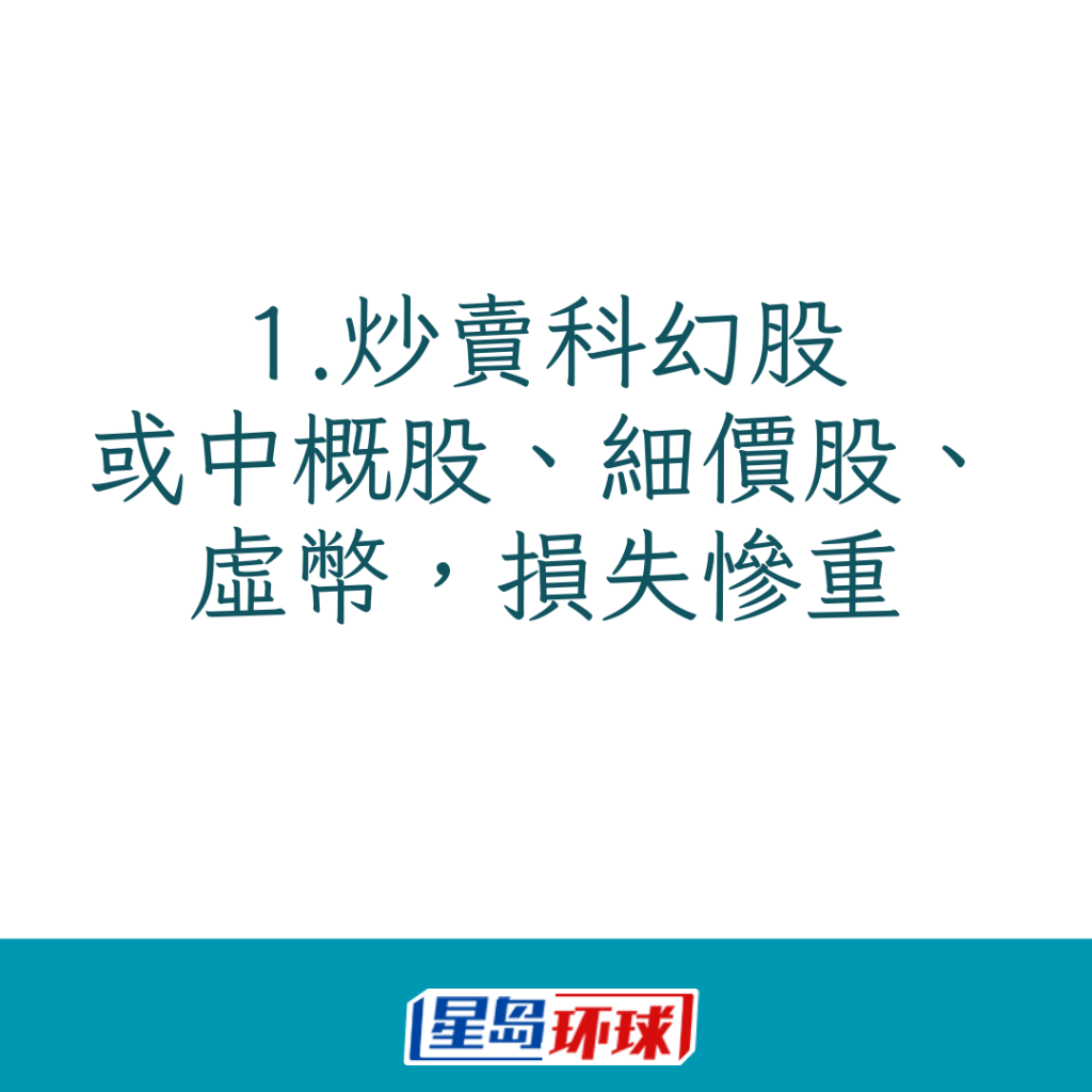 首先不少退休人士炒賣自己不熟悉的科技股、細價股?;乜?021年,他坦言很多投資者追捧科技股,入市前卻沒有做足功課,“連自己買什么也不知道,什么是藥明生物(2269)、美團(3690)、快手(1024),(結果)被人斬手,流血不止?!彼麘蚍Q這些股票為“科幻股”,因這些上市公司當時業績平平,卻被不少市場人士唱好,股民聽信投資貼士便慘被“套牢”。