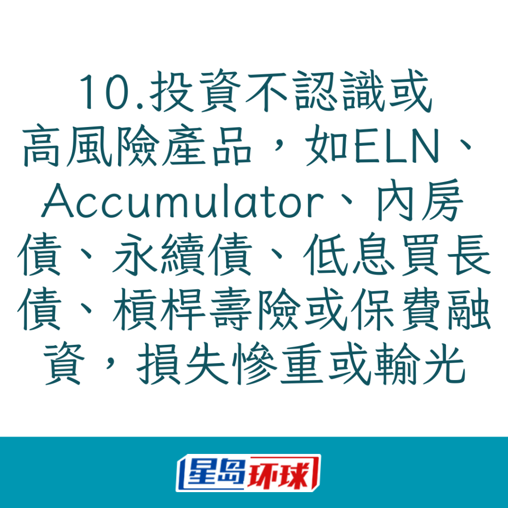 同樣地,千萬不要買一些自己不認識的衍生產品,如過去十多年,一些銀行關系經理向客戶推介股票掛鉤票據(ELN),被戲稱為“I kill you later”的累計期權(Accumulator),“記住越是接近退休年紀,因為你有錢,所以很多人會埋你身邊?!?/p>