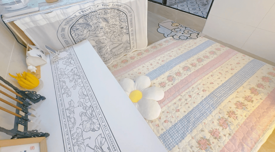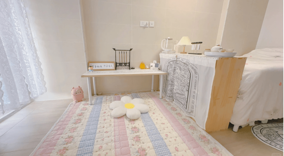 樓主在睡床旁邊放置一個小小的床頭柜,上面擺放花型床頭燈,簡單布置營造舒適個人空間;床的另一邊是樓主的休閑空間。 樓主沒有擺放又貴又占空間的沙發,反而在地上鋪了一張大的粉色地墊,地墊上放一個花花咕臣做坐墊,茶幾上放置毛筆掛架,成功利用拼多多家具打造純色文青風格家居。 帖文一出引起網民熱烈回應,網民紛紛向樓主索取拼多多購買鏈接。 樓主事后再上載另一帖文逐一推薦拼多多家具店名,其中更特別推薦一張白色羊羔絨椅子,只需¥8.4包郵!