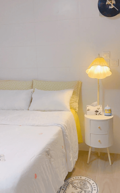 在睡床旁邊放置一個細細的床頭柜,上面擺放花型床頭燈