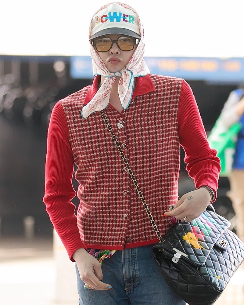 G-Dragon上周旋風式來港出席Chanel花生騷,機場Look以紅色千鳥格紋針織外套,