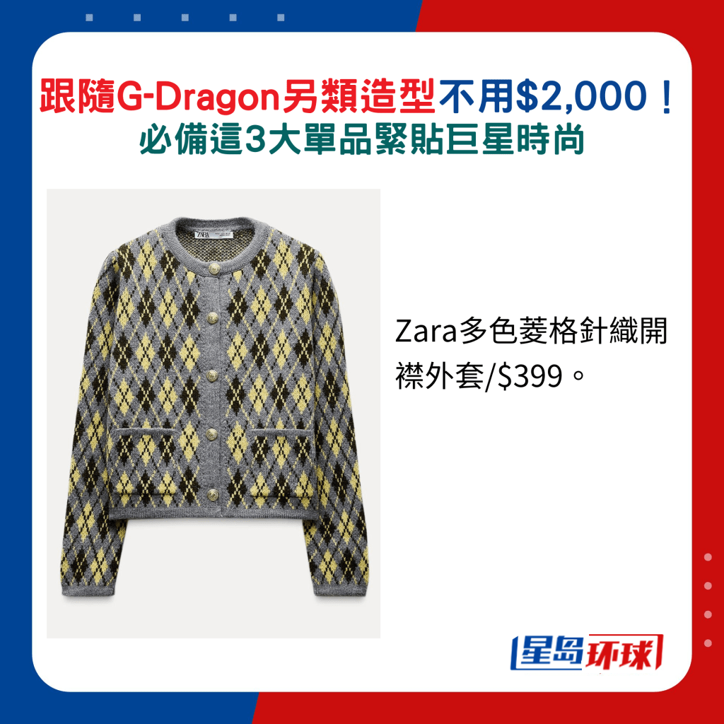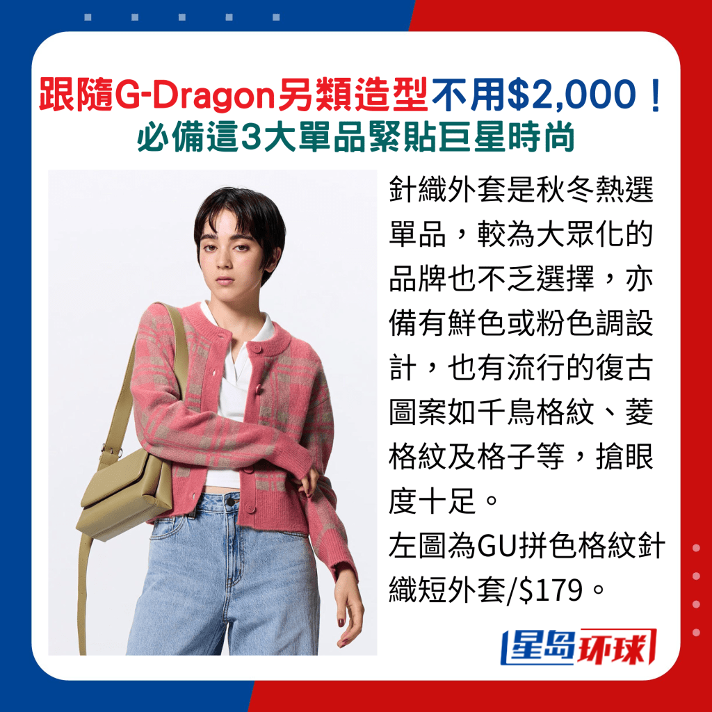 針織外套是秋冬熱選單品,較為大眾化的品牌也不乏選擇,亦備有鮮色或粉色調設計,也有流行的復古圖案如千鳥格紋、菱格紋及格子等,搶眼度十足。 想平襯GD造型,首推GU的粉紅拼灰色格紋外套,選配粉紅色鈕扣,休閑隨性。 另Zara的全新外套款式以黃、深啡及灰色為主,配搭懷舊菱形圖案及金色鈕扣,同樣典雅。 至于花呢外套大可選擇綴以閃線、珠飾亮片及金屬鈕扣的款式,拉近相似度,如Love, Bonito新推的深淺象牙白色短身設計,便是簡約又貴氣之選。