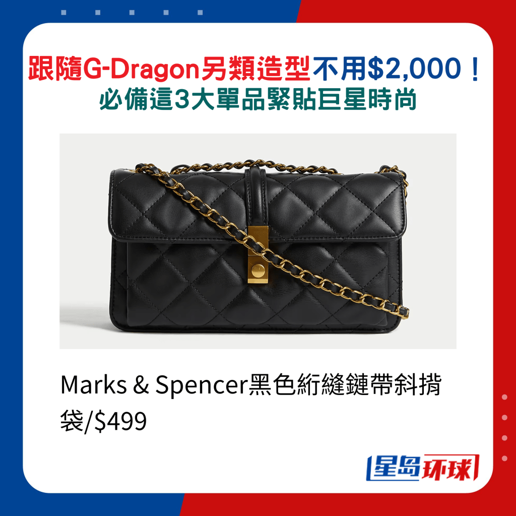選對配飾可以令造型更突出,如G-Dragon近年就喜以絲巾作頭巾配襯,更將之披于Cap帽并以絲巾包頭,展現別樹一格的品味。 同樣地,大眾化價錢都有選擇,如快速時尚品牌H&M及Zara,前者的黑白色印花圖案絲巾,兼備頭飾與肩飾,后者的頭巾則配以金屬環裝飾,方便靈活配搭。 除了以上之外,想找售價親民的Chain Bag,Charles & Keith新登場的Apfra黑色菱格紋手袋包羅大型號及手挽款式,可迎合不同造型穿搭及場合需要。