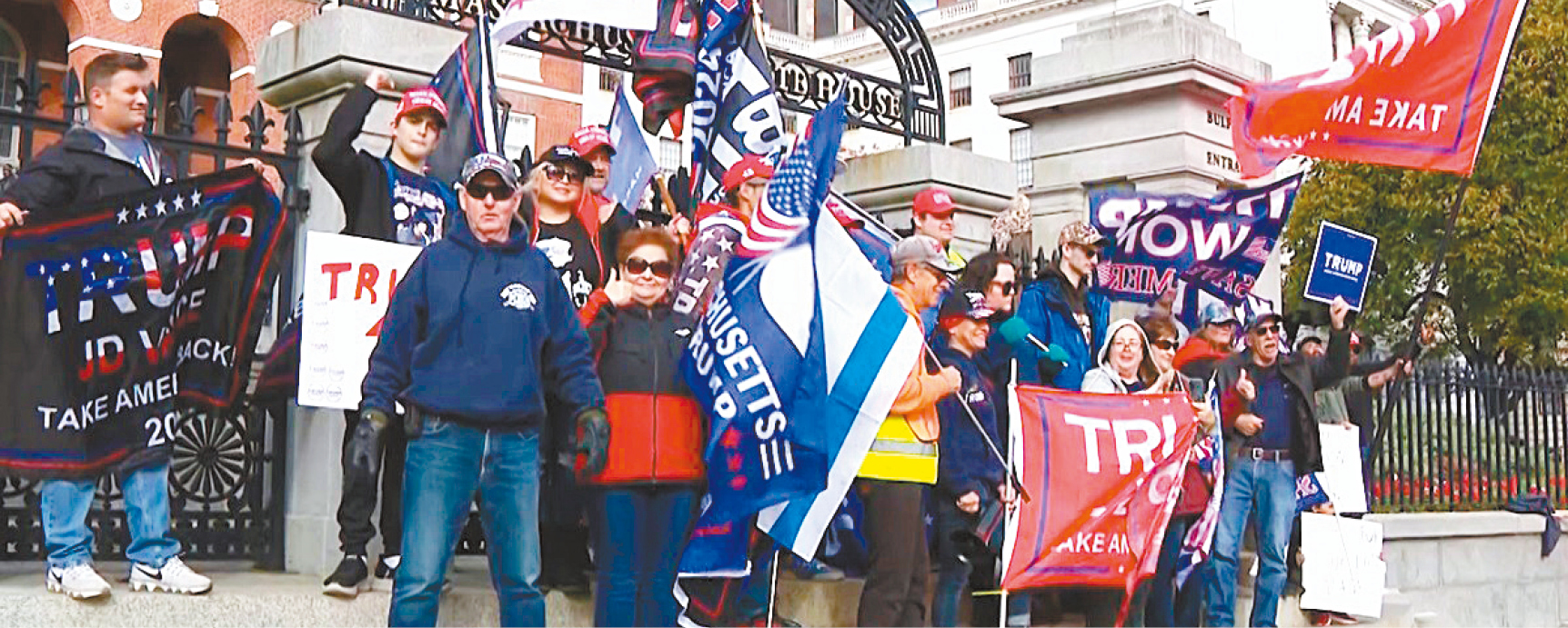 一群抗議者聚集在麻州有兩百年歷史的州府大樓前,支持當選總統特朗普驅逐無證移民的計劃??棺h者說,他們同時為慶祝特朗普在2024年總統大選中獲勝,以及他在麻州這個藍州獲得的大量選票。
