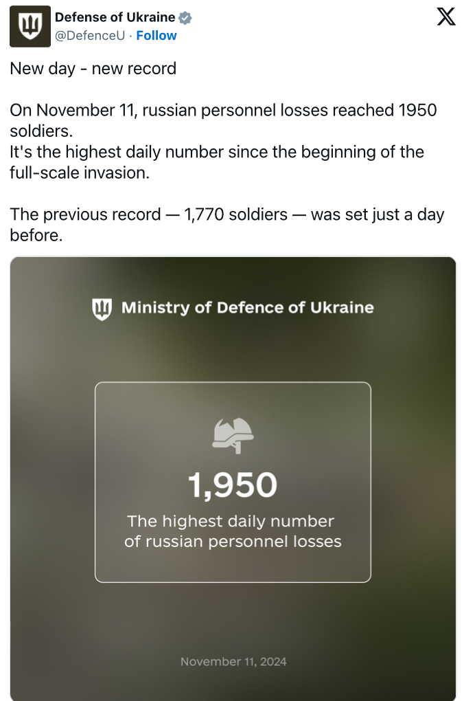 烏方指出,俄軍單日損失1950名士兵,創下開戰以來新高,上一個紀錄在此前一天才發生,11月10日一天內有1770名士兵陣亡。