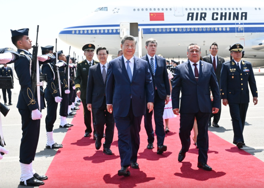 《人民日報》網表示,習近平乘專機抵達利馬卡亞俄空軍基地時,秘魯部長會議主席阿德里安森等高級官員熱情迎接。當地學生向習近平獻花,用中文對習近平到訪表示熱烈歡迎。禮兵分列紅毯兩側致敬。