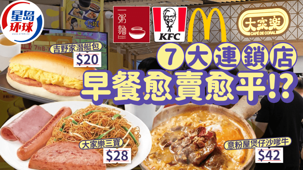 連鎖店早餐優惠|香港餐飲業競爭激烈,各大連鎖食肆不斷推陳出新,以優惠吸引更多顧客,除了有大家樂、麥當勞等抵食套餐外,主打西式食物的KFC及意粉屋更“踩過界”推出中、港式早餐,最平$18便享用!即看7間連鎖店早餐優惠合集!