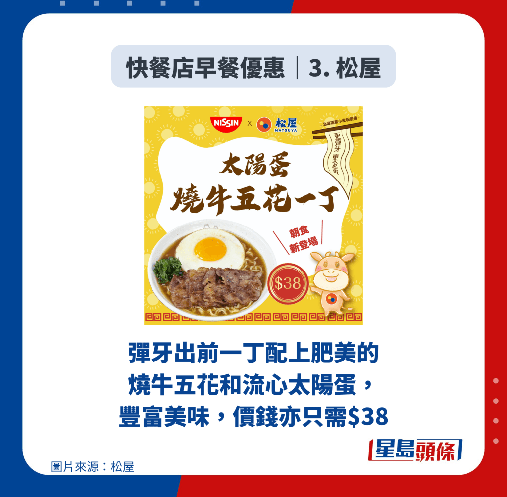 日本牛肉飯三大名店之一的松屋 Matsuya月前在香港開設首店后,備受港人歡迎,而店方亦有積極研究港式飲食文化,與出前一丁合推出“太陽蛋燒牛五花一丁”早餐,彈牙出前一丁配上肥美的燒牛五花和流心太陽蛋,豐富美味,價錢亦只需$38。