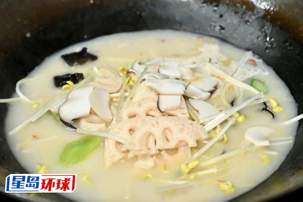 加入萵筍、云耳、蓮藕片、雞髀菇、寬薯粉及大豆芽煮滾,加入鹽和糖調味。