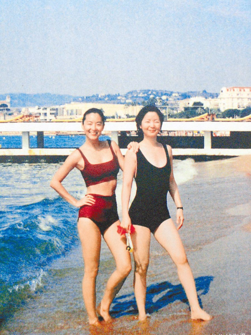 ▲林青霞(左)公開與鄧麗君在坎城海邊的珍貴泳裝照,由好友沈云攝影。(林青霞提供)
