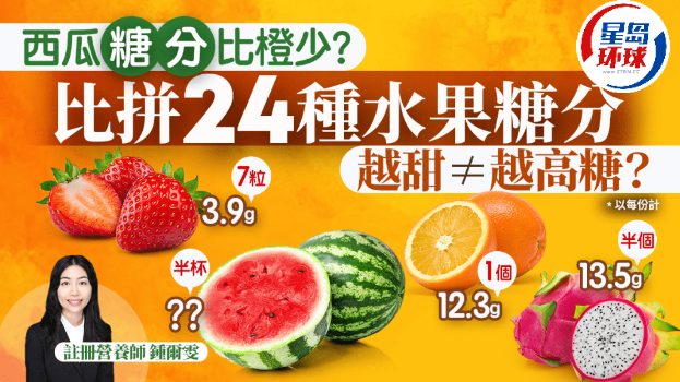 注冊營養師鐘爾雯指,很多人以為水果越甜代表糖分越高,其實不一定。她指,水果的甜味來自果糖、葡萄糖和蔗糖的比例,其中果糖甜度最高,但不代表糖分多,例如西瓜、火龍果和哈密瓜雖然甜,但每100克的糖分其實少于橙,所以,甜度不可以準確反映糖分含量。