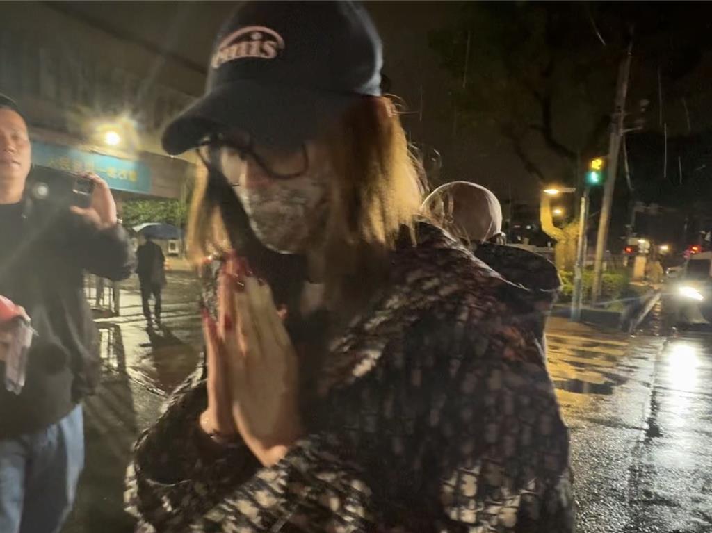 ▲郭哲敏的女友、前名模錢帥君就穿著十幾萬一件的名牌迪奧大衣、帶著兩人拖著超大咖行李箱現身新北院辦保,離去時雙手合十向記者致意。中時