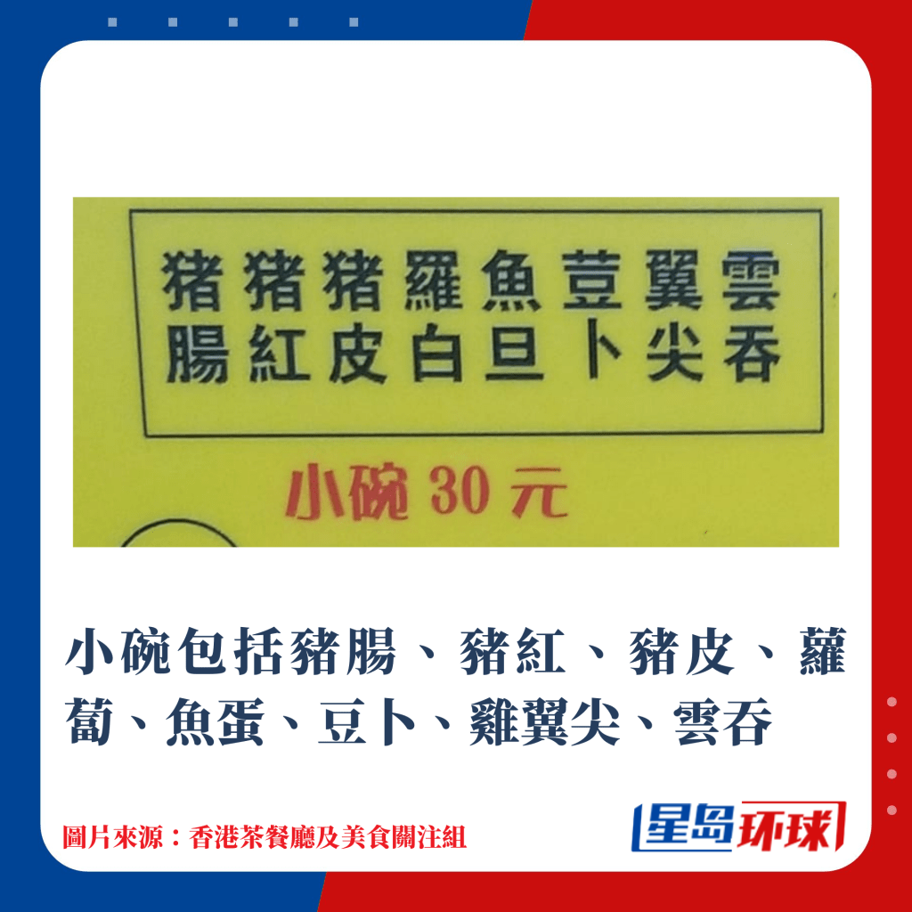 小碗包括豬腸、豬紅、豬皮、蘿卜、魚蛋、豆卜、雞翼尖、云吞