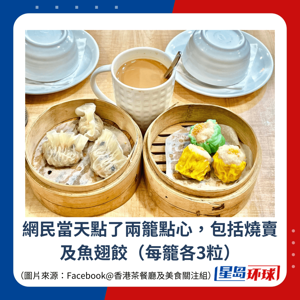 近日,有網民于社交平臺Facebook“香港茶餐廳及美食關注組”群組發文,分享佐敦廟街社企“慈悲香港食堂”最新推出的優惠價下午茶餐非常抵食!網民當天點了兩籠點心,包括燒賣及魚翅餃(每籠各3粒),連熱奶茶都只收$48。樓主大贊抵食,在帖文內形容“平過網絡酸民貧窮中位數(五十蚊)”。從樓主上載的圖片所見,每粒點心手工精致,餡料飽滿,餐廳環境簡約舒適,十分適合食客慢慢嘆茶、細味點心!
