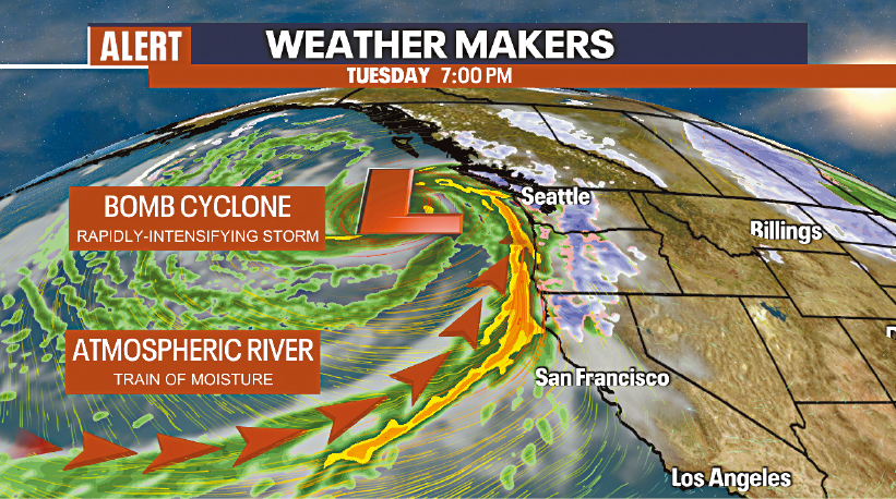 國家氣象局發出警告,表示西岸多州同時面臨強烈的“大氣河流”(atmospheric river)及“炸彈氣旋”(bomb cyclone)夾擊,加州北部、俄勒岡州和華盛頓州可能迎來颶風程度的狂風,加上大雨、洪水以及高海拔地區的降雪,3個州份或許面對停電風險。