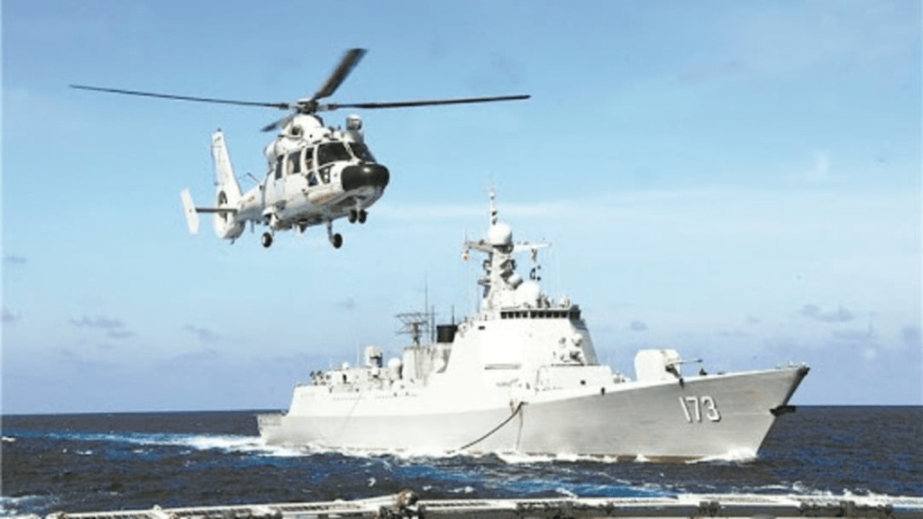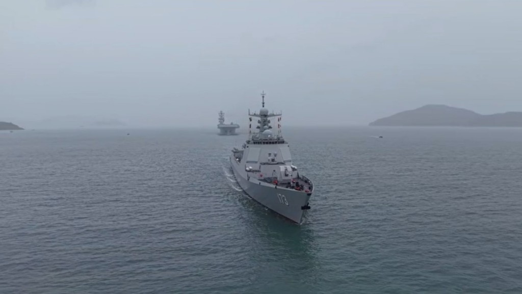 ▲海南艦和長沙艦在解放軍領航艦領航下,駛到香港以南水域。駐香港部隊微博影片截圖