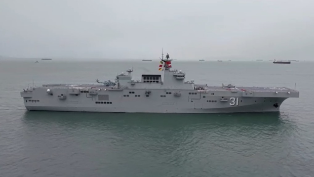 資料顯示,海南艦作為國家自主研制的首型兩棲攻擊艦,可搭載兩棲裝甲車、多型直升機、氣墊艇及坦克裝甲車,配有導彈、艦炮、電子戰等武器系統,同時配備直通甲板和塢艙,可搭載直升機、兩棲氣墊登陸艇、兩棲戰車等兩棲作戰裝備,具備立體登陸作戰能力。