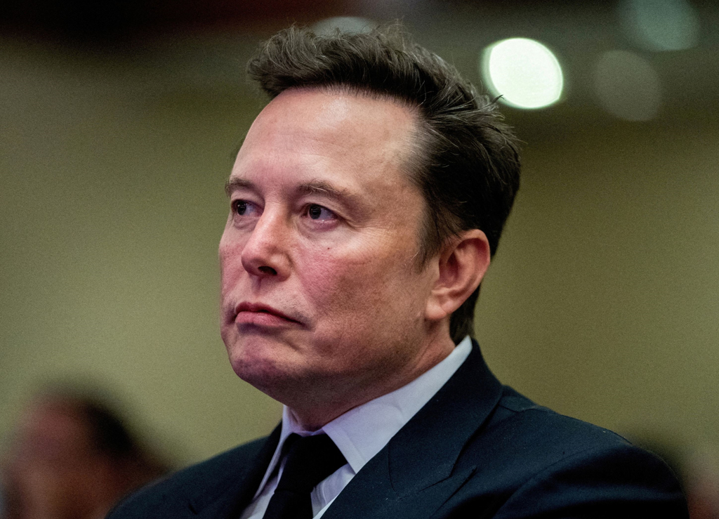 ▲獲提名共掌美國政府效率部的特斯拉執行長馬斯克13日在華府聆聽準總統特朗普向共和黨眾議員發表談話的神情。(路透)